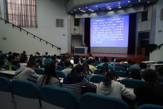 其后,严加安院士在同学们的热烈掌声中正式开始了本次讲座。严加安院士先是感谢了包刚院长的隆重介绍和各位老师同学的热情出席。他首先从王国维的“境界说”开始谈起,将文学中的“造境”和“写境”分别类比数学研究中的“创造理论”和“解决难题”,并将王国维的治学三重境界翻译为“志存高远,艰苦探索,最终顿悟”的三个研究层次。这些生动具体的类比,将国学治学和数学研究相互结合,展现了数学研究的诗意一面。所以,当严加安院士谈及“数学是一门精美的艺术”之时,同学们鼓起了热烈的掌声。