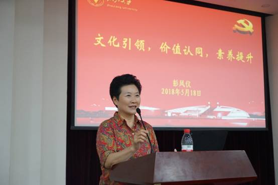 首先,彭凤仪教授立足于“文化引领站在什么样的起点”、“文化的坐标点在哪里”、“文化的站位在哪里”三个方面,为党员们讲述了当代中国的文化特色。随后,彭教授以“你所在的城市拥有的气质”为题,将党员们的目光从近31个城市拥有的气质转到浙大人所拥有的气质上。彭老师结合浙大文化,从“浙江大学文化建设成果”和“浙江大学校歌”两个方面,向党员们诠释了浙大文化建设工作及浙大文化精神。