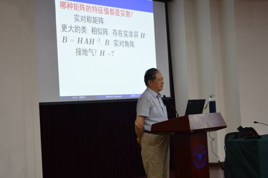 陈院士在同学们的热烈掌声中正式开始了本次讲座。他先从随机过程的一类――生灭过程讲起,并以此为出发点介绍了实可配称、复可配称矩阵的特征值问题。特别地,他向同学们讲述了自己在研究过程中推导出的几个重要结论,还推荐了应用广泛的非平衡系统的数学工具。这些定理及推论的介绍让同学们对该领域有了一定的认识,并激发了大家进一步探索的热情。