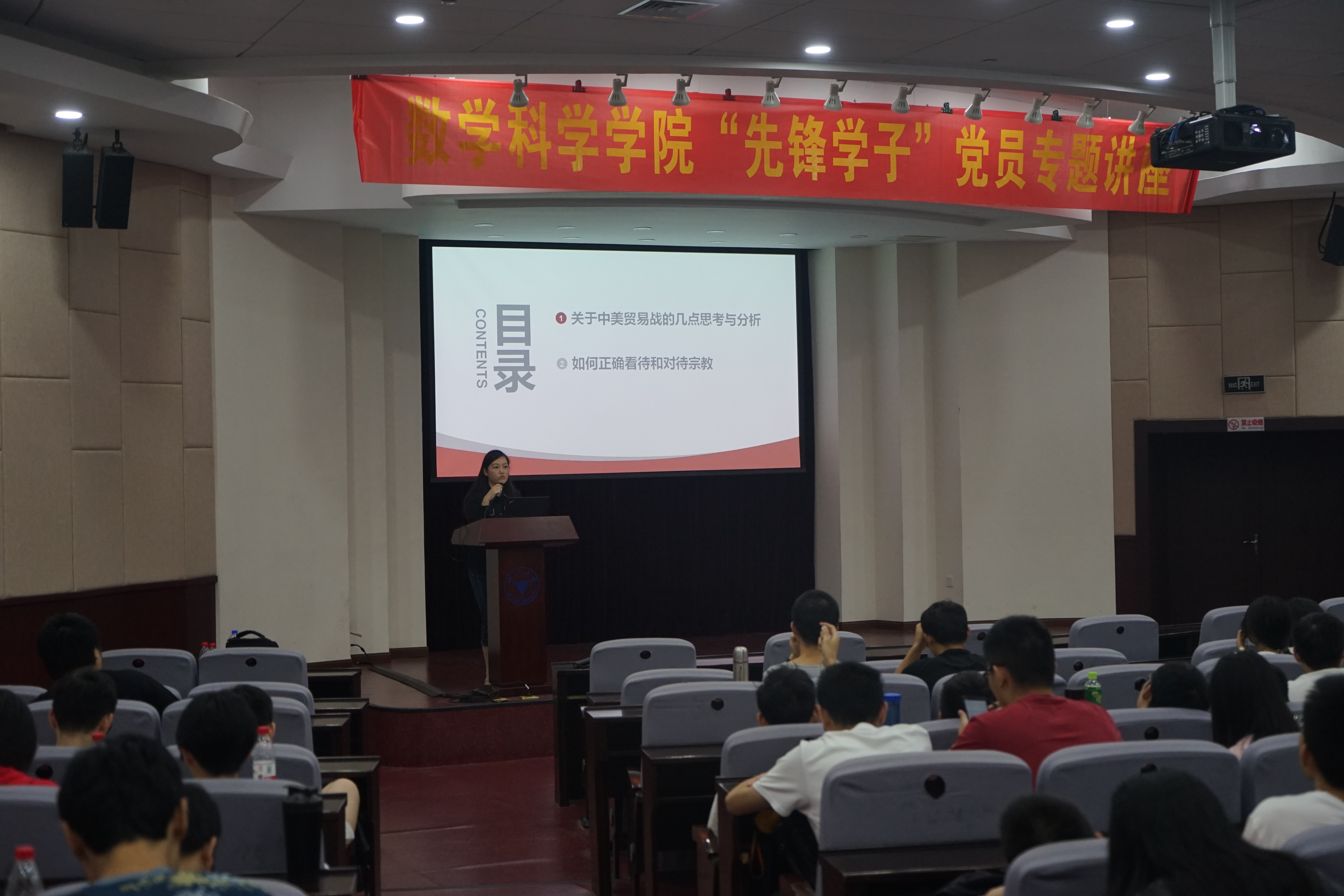 2018年9月30日,数学科学学院党委在浙江大学玉泉校区邵科馆117报告厅举办了“华体会网页版‘先锋学子’党员专题学习会”。数学科学学院党委副书记姚晨结合习近平总书记系列重要讲话精神,以“我们面临的形势与应有的准备”为主题展开宣讲。此次会议由数学科学学院团委副书记李萌主持,数学科学学院学生党员参与会议。