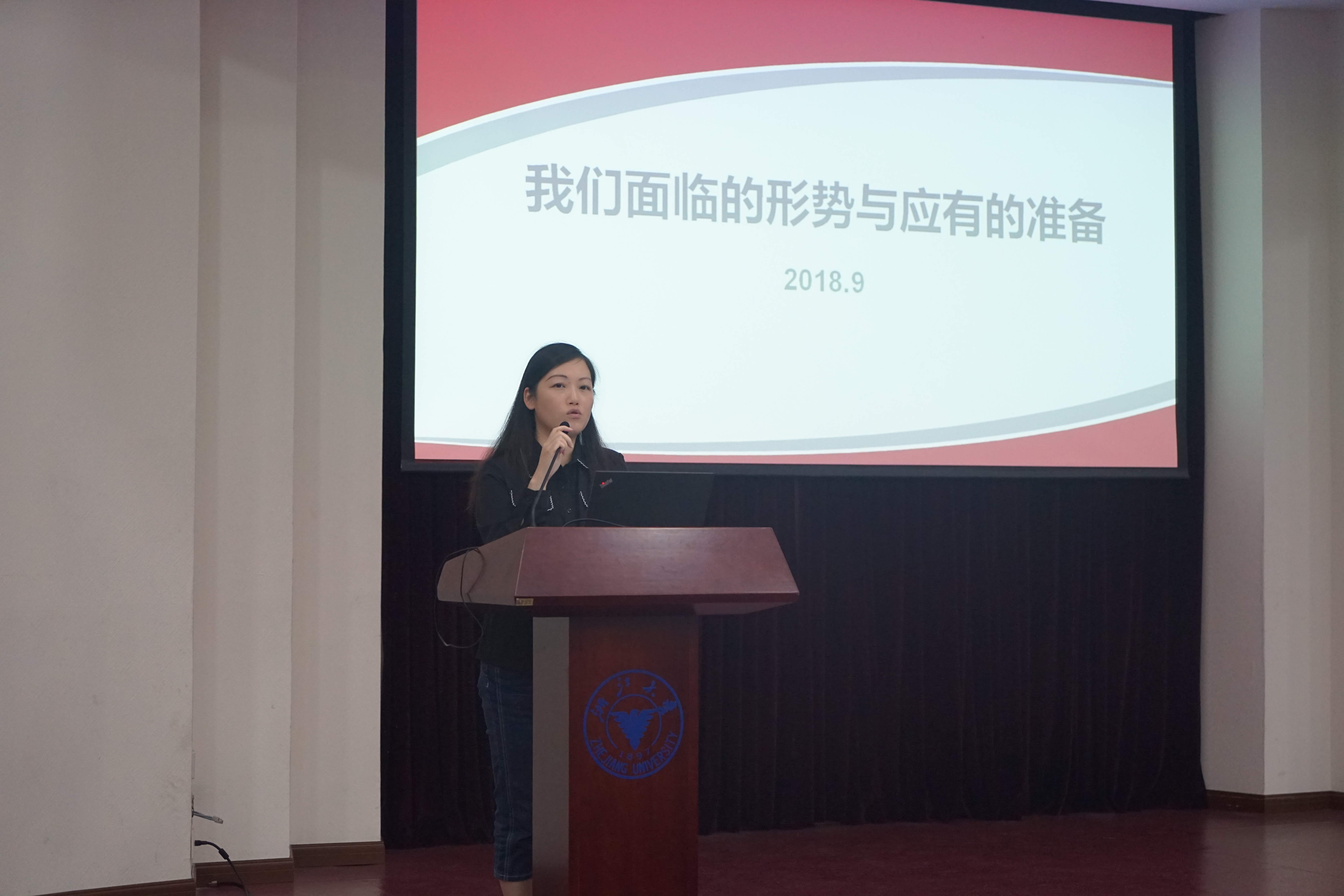 首先,姚晨老师结合当下国际热门话题,为党员们讲述了目前中国面对的国际形势。姚老师提到作为新时代的大学生,应该深刻领会习近平总书记有关观察国际形势的“三观”论断和战略思维以及对目前国际形势的基本判断,树立正确的历史观、大局观、角色观。