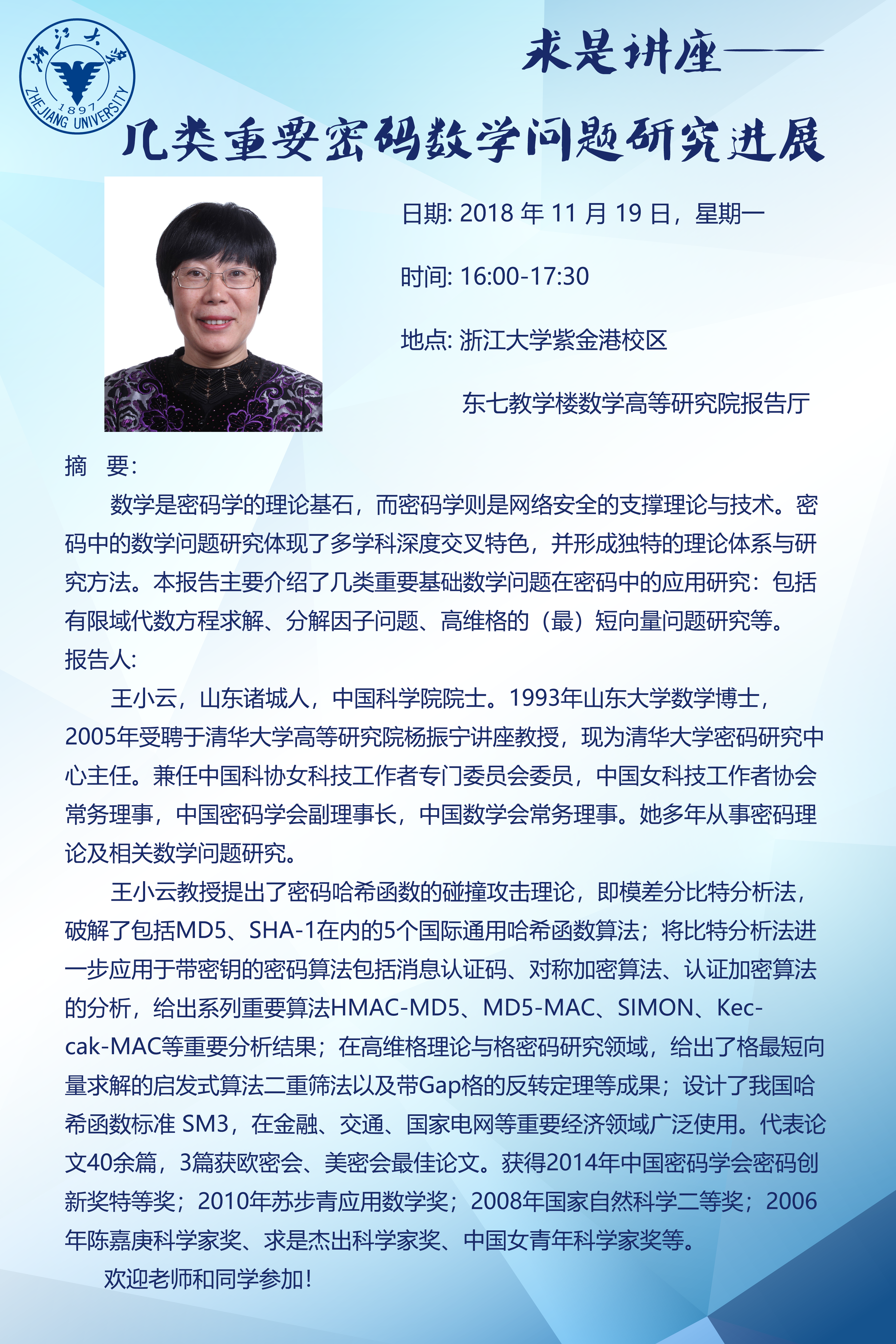 学术科研 学术团队 学术活动 学术会议 学术报告 讨论班 School Colloquium 信息公告 文件汇编 2018 华体会(中国) > 求是讲座――几类重要密码数学问题研究进展 来源:数学科学学院 发布时间:2018-11-16 716