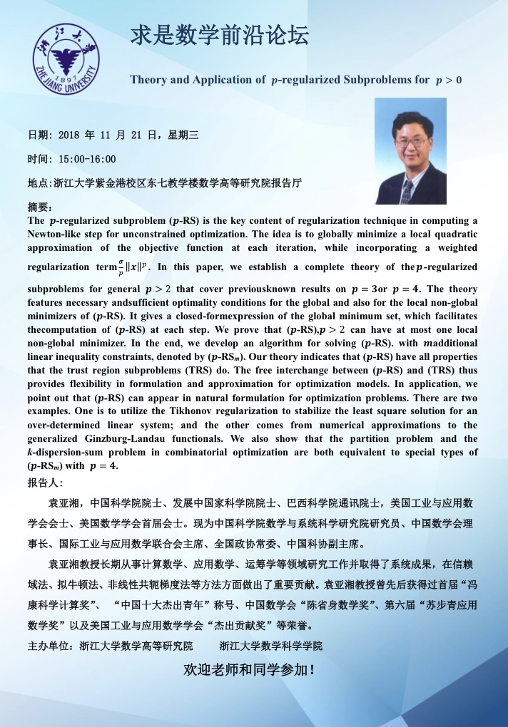 学术科研 学术团队 学术活动 学术会议 学术报告 讨论班 School Colloquium 信息公告 文件汇编 2018 华体会(中国) > 求是数学前沿论坛之袁亚湘院士讲座 来源:数学科学学院 发布时间:2018-11-20 783