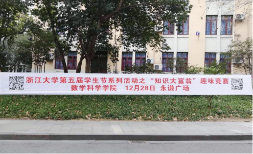 2018年12月28日,数学科学学院举办的浙江大学第五届学生节系列活动之“知识大富翁”趣味竞赛在玉泉校区永谦广场圆满收官。本次活动是在学院团委的指导下,由学院研博会具体组织策划的。活动将深入学习贯彻习近平新时代中国特色社会主义思想,深入贯彻落实学校第十四次党代会精神,与传承陈苏学派,争创世界一流的学院精神相结合,旨在引导同学们了解中华传统知识、学校与学院历史,体会数学之美,促进全面健康发展。