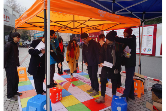 下午2点开始,活动在永谦广场火热地进行,虽然寒风凛冽,但是大家的热情丝毫不减。活动现场摆放着一张“大富翁”地图,参与者通过抛骰子、答题获得奖品。本着让大家享受游戏的宗旨,每位参与者都能获得一份精美的零食大礼包,答对题目较多的同学还能获得书籍奖励。六大类题型――党史校史文学影视音乐数学让参与者们发挥自己的特长,收获了知识与欢乐。
