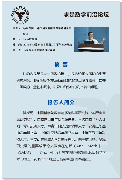 通知公告 通知公告 重要通知 本科生 研究生 科研 教学 人事 公示 学术活动 学术会议 新闻图片 院系新闻 院内邮件 重要通知 华体会(中国) > 求是数学前沿论坛之孙斌勇院士讲座 来源:数学科学学院 发布时间:2019-12-18 1026