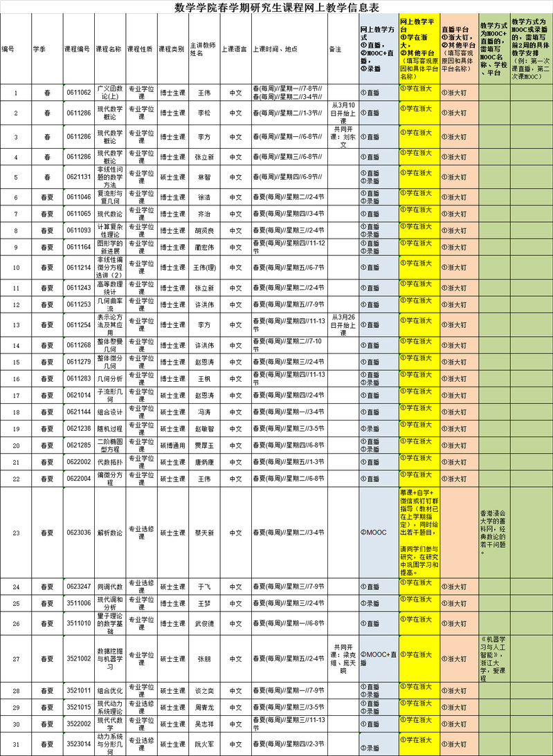 通知公告 通知公告 重要通知 本科生 研究生 科研 教学 人事 公示 学术活动 学术会议 新闻图片 院系新闻 院内邮件 研究生 华体会(中国) > 数学科学学院2019--2020学年春学期研究生课程网上教学信息表 来源:数学科学学院 发布时间:2020-02-18 611