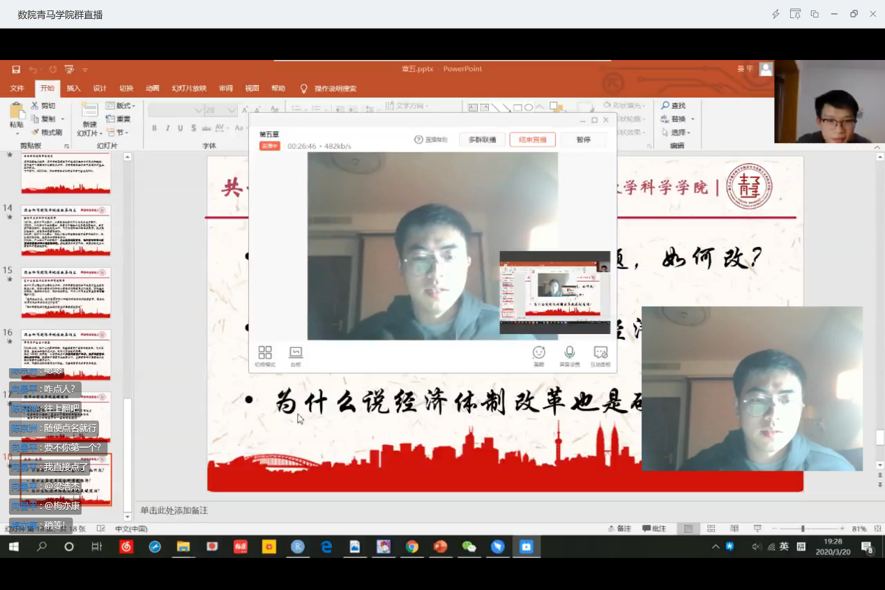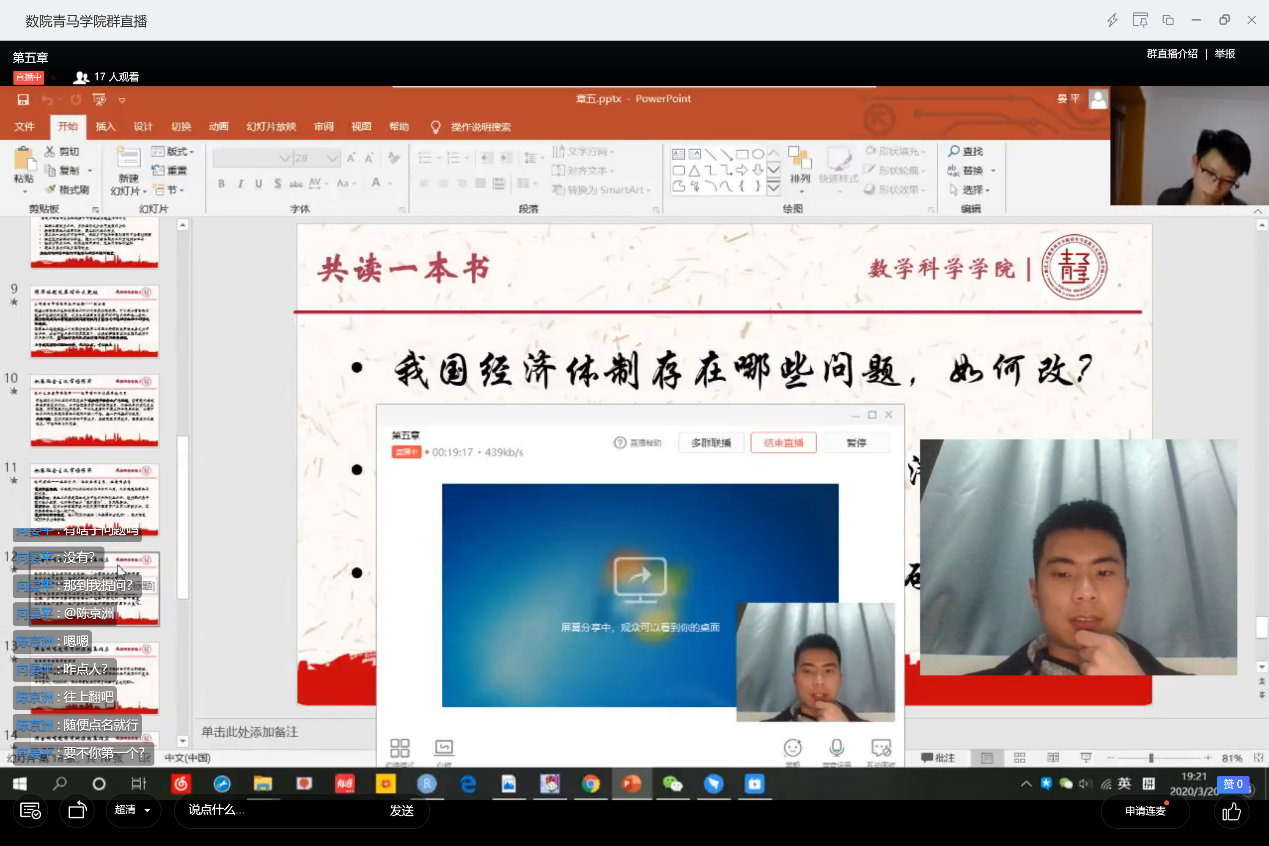 3月20日晚7时许,数学科学学院青马学院的一众学员,相约钉钉群,共读一本书。目前国内的疫情已渐渐平息,可学员们的学习热情,在本次第三期分享会中又涌向了新的高潮。