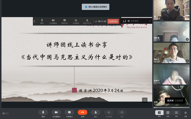2020年3月24日晚上8点,数学科学学院“核心价值观进班级”讲师团第三次线上读书交流分享会如期召开。本期分享会由陈京洲和唐松乔两位同学主讲,他们分别对《当代中国马克思主义为什么是对的》一书的第五章和第六章做了内容梳理与心得体会的分享。