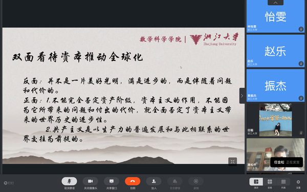 任金松同学围绕“人类命运共同体”这个主题,结合当下疫情,分享了自己的读书心得。对于全球化这个问题,要辩证地去看待,一方面,全球化并不是完全一片光明的,而是伴随着问题和代价的;另一方面,不能全面否定资本主义带来的世界历史的进步性。任金松同学详细地阐释了习近平总书记关于命运共同体的“五观”的概念——权力观、利益观、文明观、安全观、发展观,分享了自己对“和而不同,兼容并蓄”的理解。本次疫情也充分体现了“人类命运共同体”的特点,面对灾难,没有一个国家、没有一个人可以置身事外,只有以开放包容的心态合作共通,才能战胜疫情。