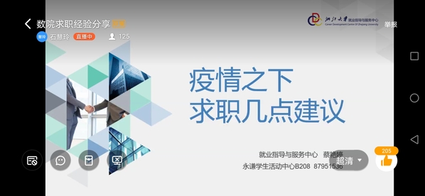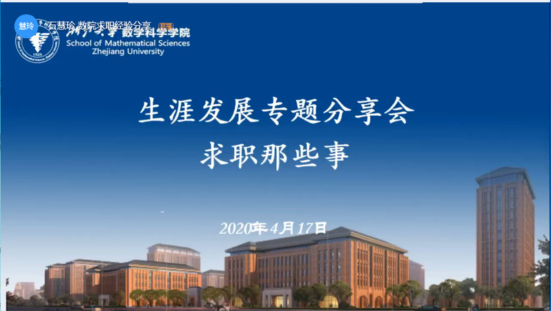 为贯彻学校党委会和就业工作会精神,2020年4月18日,数学科学学院求职生涯发展专题分享会通过钉钉直播顺利举行,会议由学院辅导员石慧玲主持,邀请了就业指导与服务中心综合办公室副主任蔡艳婷老师,以及已获得不同工作领域offer的优秀数院学子进行技能指导和经验分享。他们是:签约腾讯科技(深圳)有限公司的甘伟男、签约淘宝(中国)软件有限公司的高璇、签约杭州市余杭高级中学的熊焕焕。