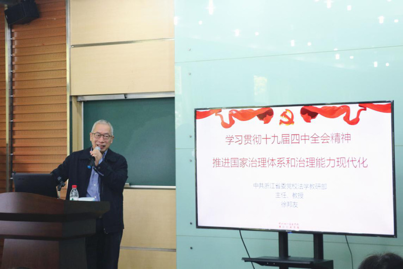 4月17日,由数学科学学院党委、地球科学学院党委、物理学系党委、化学系党委及心理与行为科学系党委共同主办的理学各党委联学联建第五期——党的十九届四中全会精神专题学习活动顺利举办,邀请到浙江省委党校法学教研部主任徐邦友教授做《学习贯彻十九届四中全会精神,推进国家治理体系和治理能力现代化》主题报告。