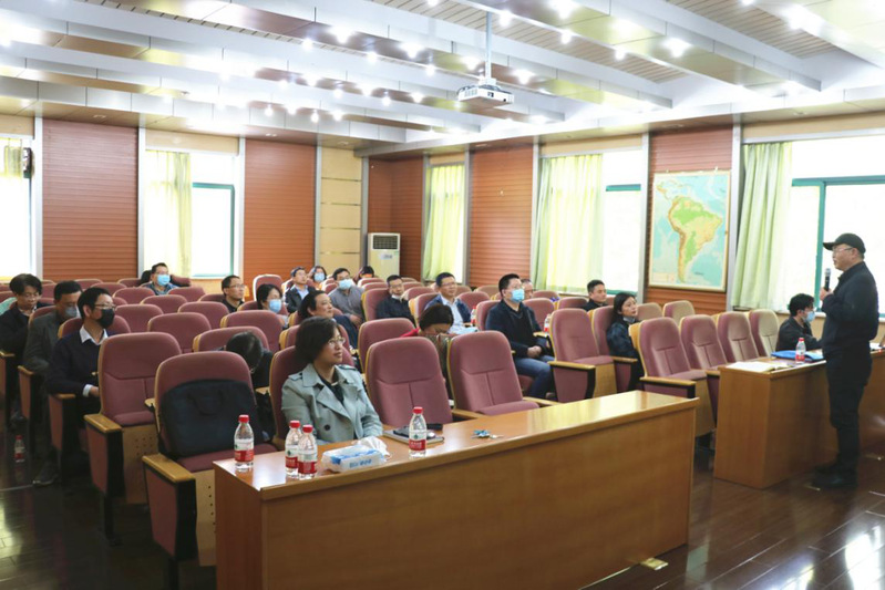 数学科学学院党委书记闻继威主持报告会,理学各院系中层领导班子成员在地球科学学院203报告厅进行集体学习,各院系师生党员参与钉钉群直播学习。