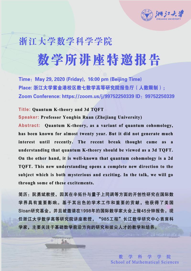 学术科研 学术团队 学术活动 学术会议 学术报告 讨论班 School Colloquium 信息公告 文件汇编 2020 华体会(中国) > 数学所讲座| Quantum K-Theory and 3d TQFT 来源:数学科学学院 发布时间:2020-05-25 705