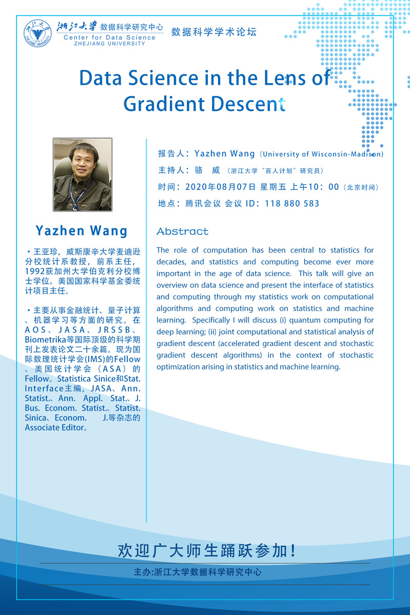 学术科研 学术团队 学术活动 学术会议 学术报告 讨论班 School Colloquium 信息公告 文件汇编 2020 华体会(中国) > Data Science in the Lens of Gradient Descent 来源:数学科学学院 发布时间:2020-08-04 492