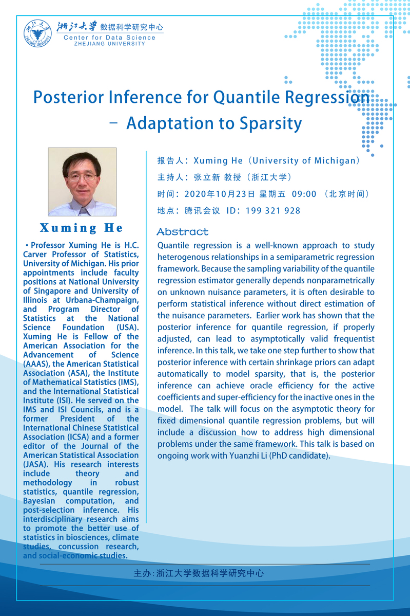 学术科研 学术团队 学术活动 学术会议 学术报告 讨论班 School Colloquium 信息公告 文件汇编 2020 华体会(中国) > Posterior Inference for Quantile Regression – Adaptation to Sparsity 来源:数学科学学院 发布时间:2020-10-13 559