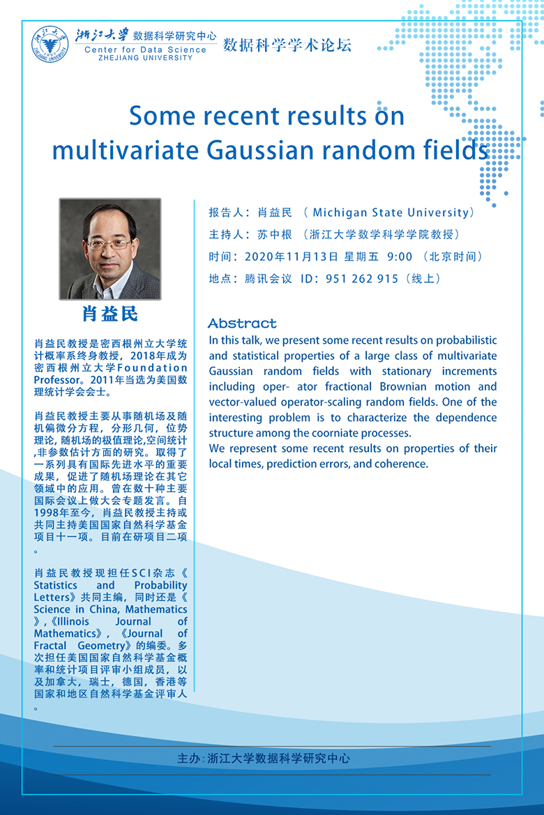学术科研 学术团队 学术活动 学术会议 学术报告 讨论班 School Colloquium 信息公告 文件汇编 2020 华体会(中国) > Some recent results on multivariate Gaussian random fields 来源:数学科学学院 发布时间:2020-11-06 453