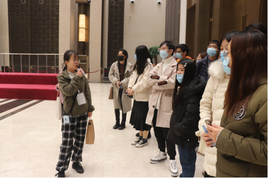 首先,在讲解员的带领下,大家来到了博览中心二层的迎宾厅前。映入眼帘的莲花建筑和G20峰会的主题“构建创新、活力、联动、包容的世界经济”生动契合。杭州国际博览中心作为G20峰会主场,严格依照“安全运行万无一失,接待服务滴水不漏”的标准,以“最高标准、最快速度、最实作风、最佳效果”,展现了大国风范、江南特色、杭州元素。