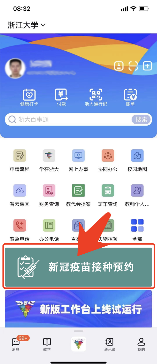 打开本人浙大钉,点击“新冠疫苗接种预约”;