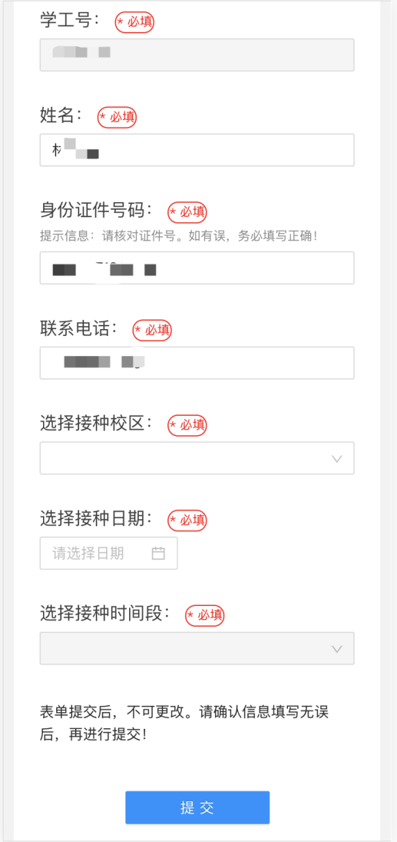进入预约界面,在认真阅读完疫苗接种说明之后,页面上拉会出现预约填报内容,请确认本人姓名、证件号码、联系电话,对于信息有误可以修改,然后选择接种校区、接种日期和接种时间段,选择完毕点击提交。需要注意以下两点: