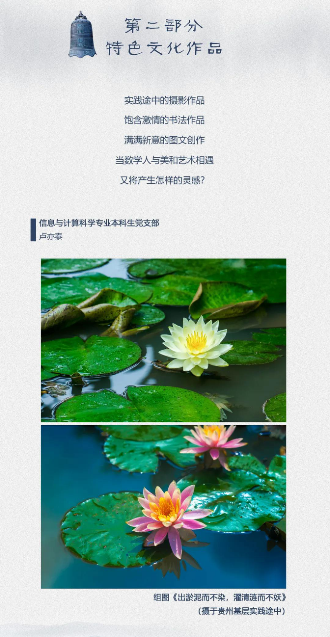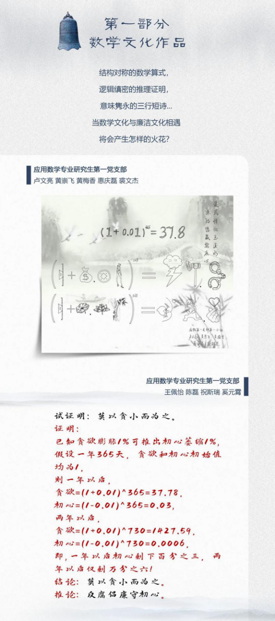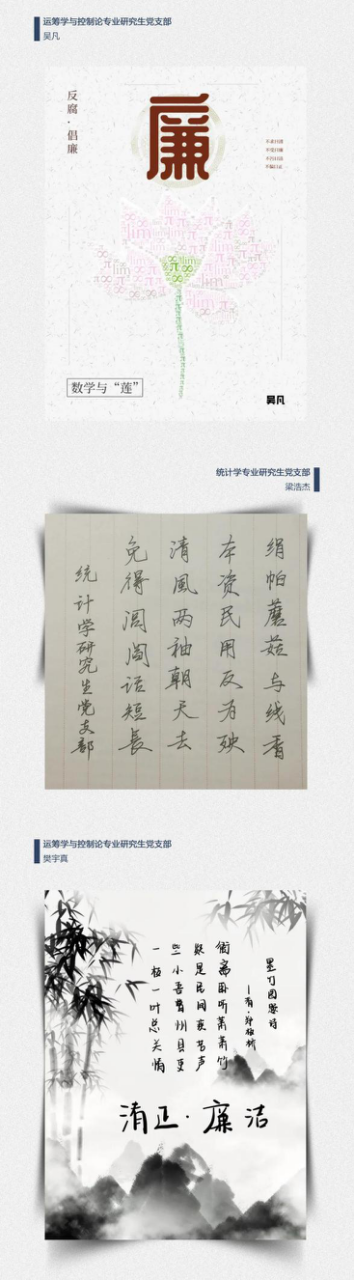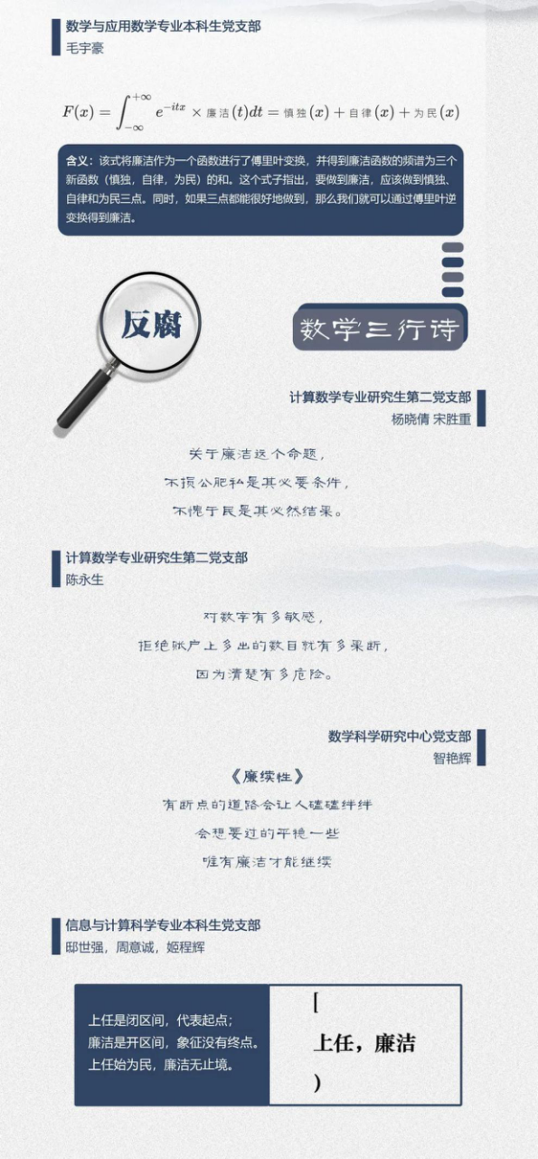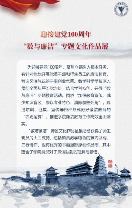 党群学工 党委概况 党建工作 文件汇编 团学通知 团学新闻 就业信息 评奖评优 学生资助 学生文件资料 规章制度 教工之家 团学新闻 华体会(中国) > 【迎接建党100周年】数学科学学院“数与廉洁”专题文化作品展 来源:数学科学学院 发布时间:2021-01-26 151