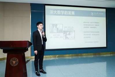在题为“治学更图治世,育人桃李满园”的演讲中,赵城凡同学结合学院与专业特点,以三个定积分为媒介,从“勇攀科学高峰、学成报效祖国、育人薪火相传”三个方面介绍了自己心目中浙江大学以及浙大数学的精神内核。“要在20年内把浙江大学数学系办成第一流数学系”的陈建功先生、苏步青先生;“一是做革命者,救国救民;二是做科学家,改变世界”的谷超豪先生;胸怀赤子之心、秉承报国之志的董光昌教授;带领师生建设世界一流的数学学科的励建书院士、孙斌勇院士、阮勇斌院士……追思过往,浙大数学人时刻铭记并感恩先辈春风化雨、鞠躬尽瘁;展望未来,浙大数学人始终感怀并坚信自己勇毅笃守、奋斗奉献。