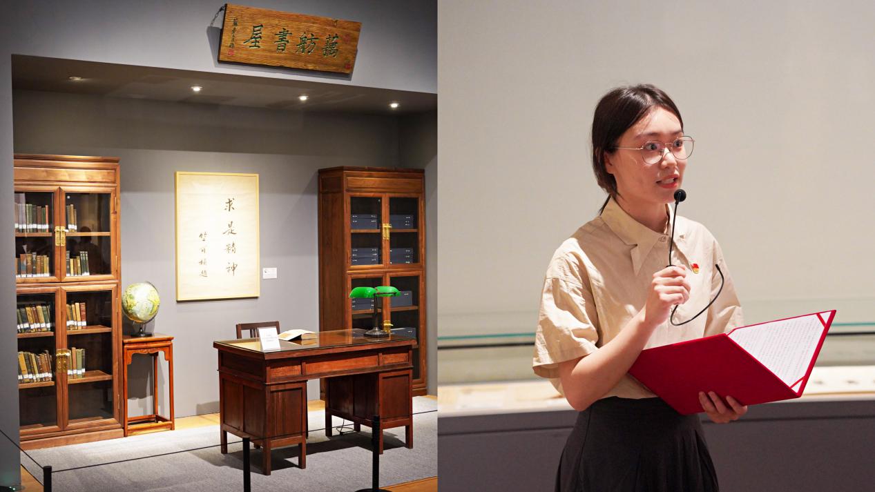 且行且思,当党员们行至一座旧式的书房造景,抬头便看到我院院友,著名数学家苏步青题写的“藕舫书屋”。数学与应用数学专业本科生党支部党员,学院“核心价值观进班级”讲师团讲师陆思棋便以书斋名为引,为师生党员奉献了一场精彩的微党课宣讲。她以苏步青先生与竺可桢老校长的深厚情谊为题,讲述了从竺校长对苏先生的照顾,到苏步青先生投桃报李将竺校长视为知己,用自己的一生践行了“大先生”应有的品格风骨。陈苏精神是动荡时局中的潜心钻研;是艰难抉择面前的以身报国;是求知路上的薪火相传;是滔天风浪中的道德高标。而每一个新时代的浙大数学人,都应以自身行动诠释这伟大的科学家精神,赓续红色基因和学脉,使其在岁月的长河中历久而弥新。