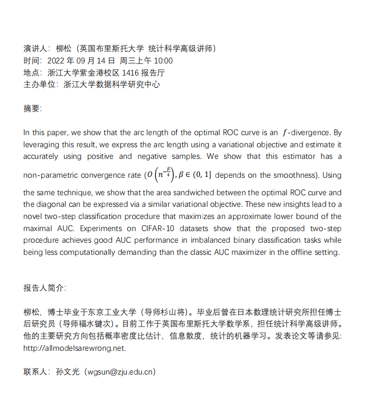 学术科研 学术团队 学术活动 学术会议 学术报告 讨论班 School Colloquium 信息公告 文件汇编 2022 华体会(中国) > Estimating the Arc Length of the Optimal ROC Curve and Lower Bounding the Maximal AUC 来源:数学科学学院 发布时间:2022-09-14 334