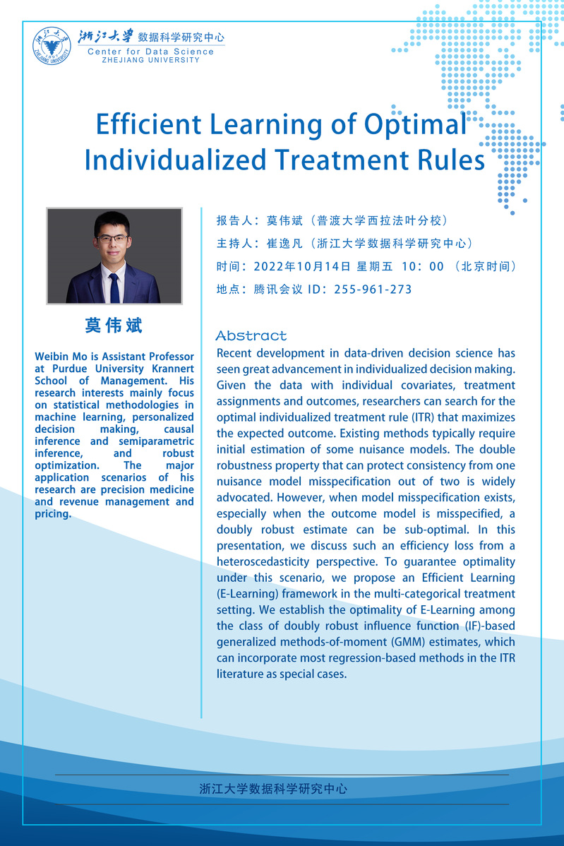 学术科研 学术团队 学术活动 学术会议 学术报告 讨论班 School Colloquium 信息公告 文件汇编 2022 华体会(中国) > Efficient Learning of Optimal Individualized Treatment Rules 来源:数学科学学院 发布时间:2022-10-13 203