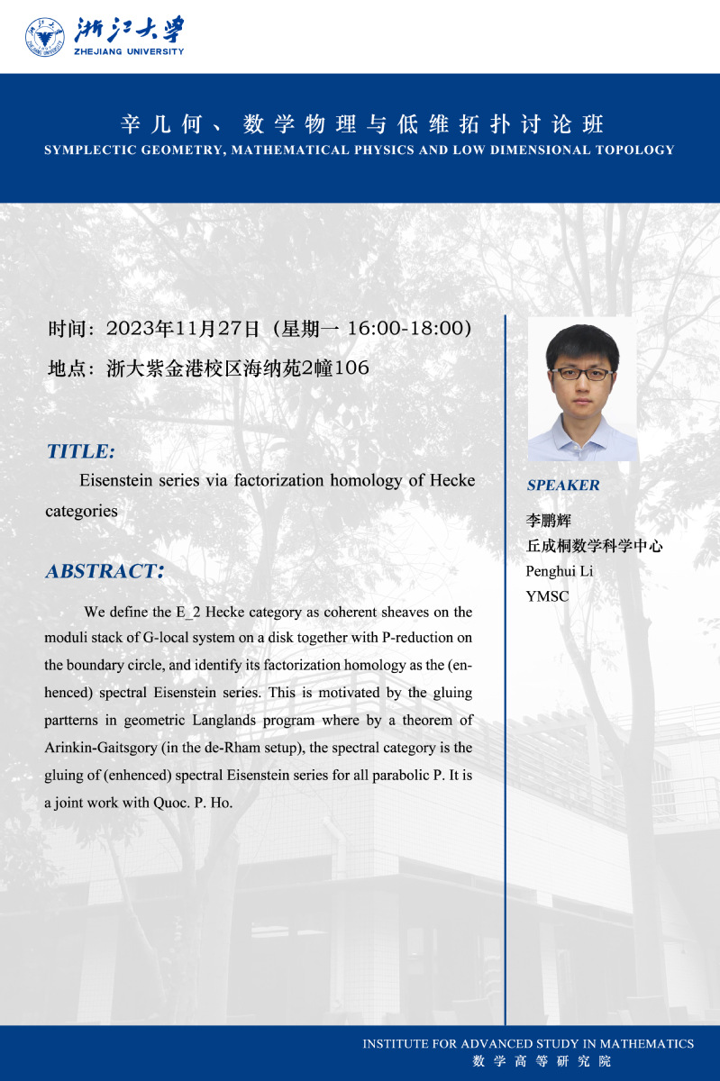 学术科研 学术团队 学术活动 学术会议 学术报告 讨论班 School Colloquium 信息公告 文件汇编 讨论班 华体会(中国) > 辛拓扑与物理讨论班——Eisenstein series via factorization homology of Heckecategories 来源:数学科学学院 发布时间:2023-11-27 295