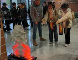随后李辉老师向师生讲解灭火器的使用方法,并用电子仿真灭火器带领师生进行灭火演练。灭火器的使用步骤为“提、拔、握、压”——提起灭火器、拔出插销、握住喷嘴、压下压把进行喷射四个步骤。李老师指出,在实际灭火操作中,使用者应注意保持与火焰的安全距离,大约1.5米到2米。特别需要注意的是,在户外环境下,应站在风向背面进行操作,以避免烟雾和火焰的侵袭。在谢波老师的指导下大家逐个上前练习,熟练地掌握了正确使用灭火器的技能。