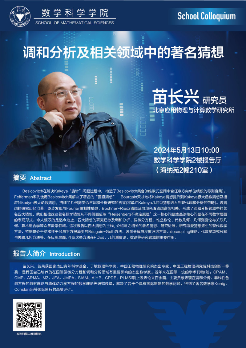 学术科研 学术团队 学术活动 学术会议 学术报告 讨论班 School Colloquium 信息公告 文件汇编 School Colloquium 华体会(中国) > 调和分析及相关领域中的著名猜想 来源:数学科学学院 发布时间:2024-05-07 134