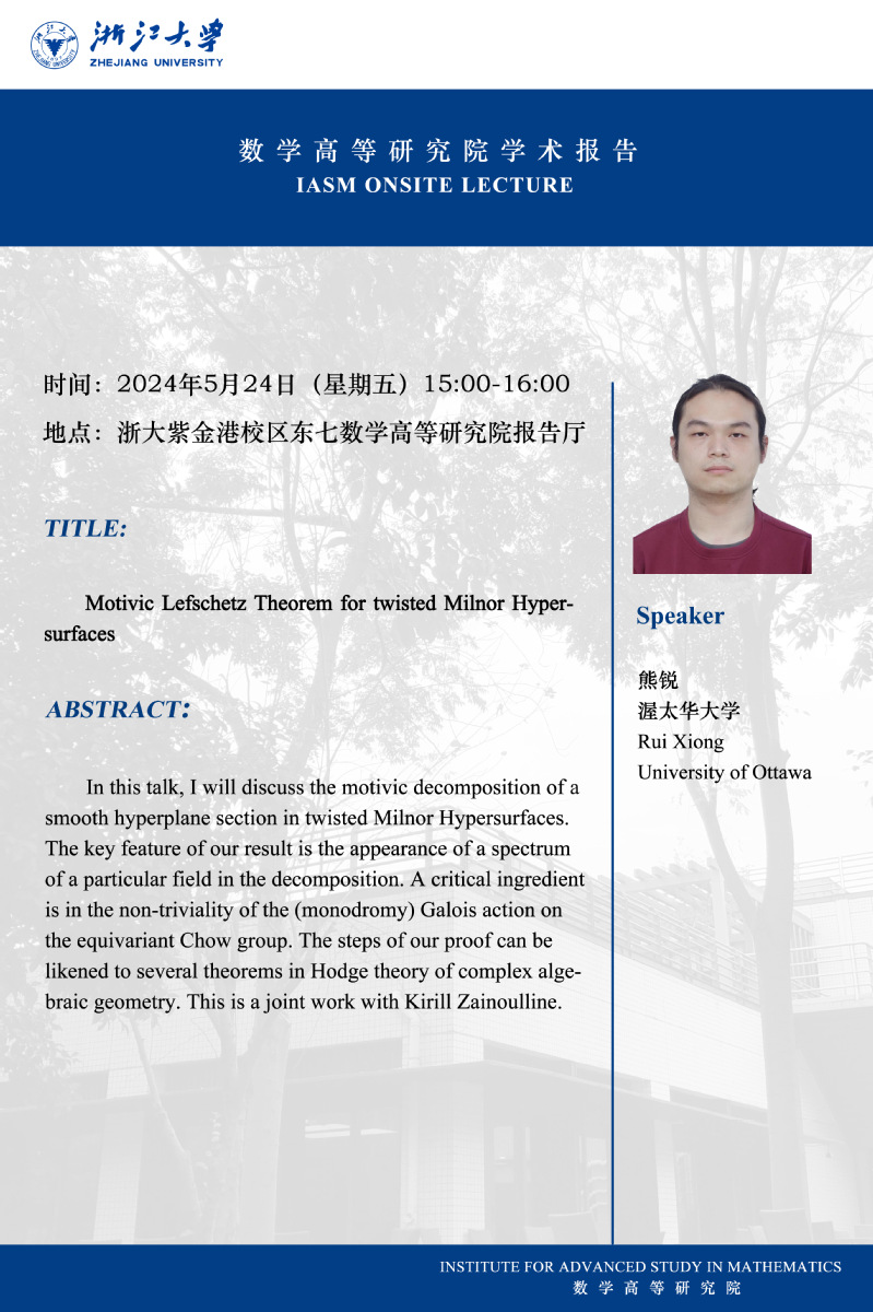学术科研 学术团队 学术活动 学术会议 学术报告 讨论班 School Colloquium 信息公告 文件汇编 学术活动 华体会(中国) > Motivic Lefschetz Theorem for twisted Milnor Hypersurfaces 来源:数学科学学院 发布时间:2024-05-24 282