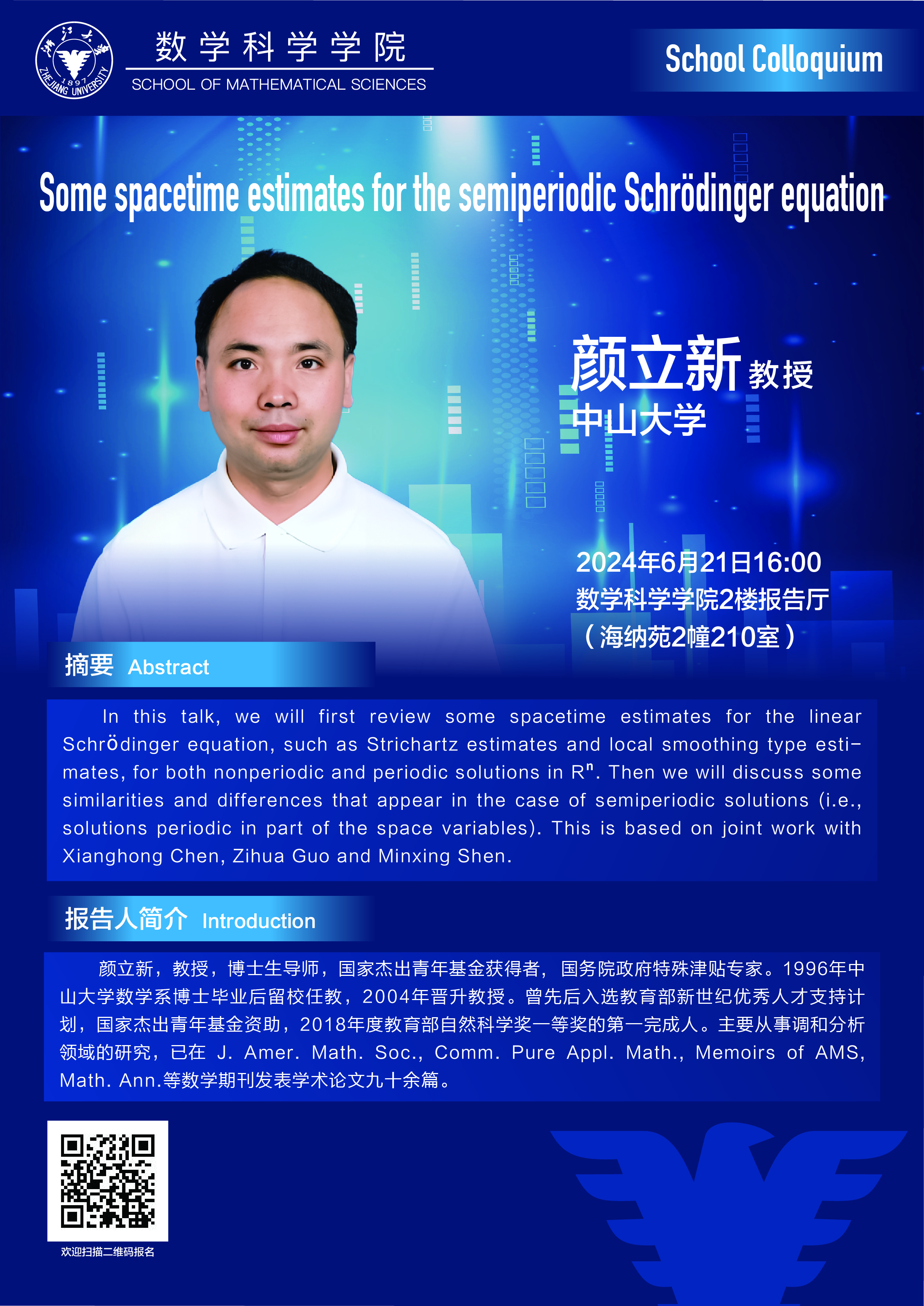 学术科研 学术团队 学术活动 学术会议 学术报告 讨论班 School Colloquium 信息公告 文件汇编 School Colloquium 华体会(中国) > School Colloquium——Some spacetime estimates for the semiperiodic Schrödinger equation 来源:数学科学学院 发布时间:2024-06-17 380