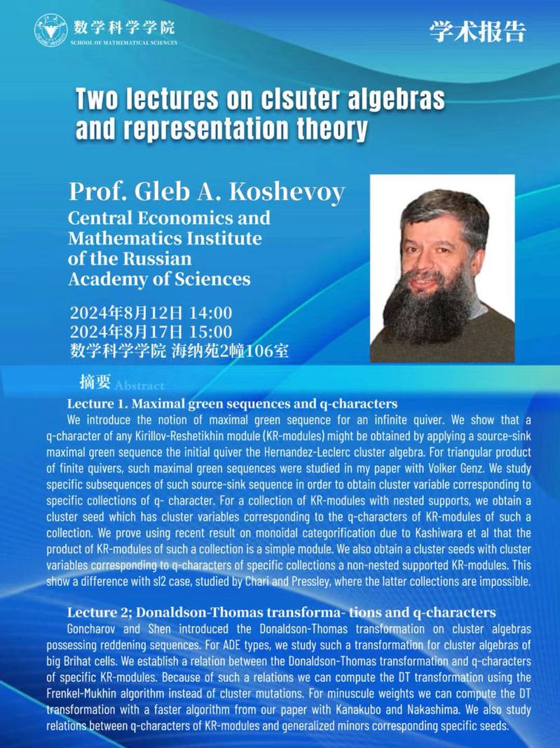学术科研 学术团队 学术活动 学术会议 学术报告 讨论班 School Colloquium 信息公告 文件汇编 表示论与数论讨论班 华体会(中国) > 代数与表示论讨论班——Two lectures on cluster algebras and representation theory 来源:数学科学学院 发布时间:2024-08-12 311