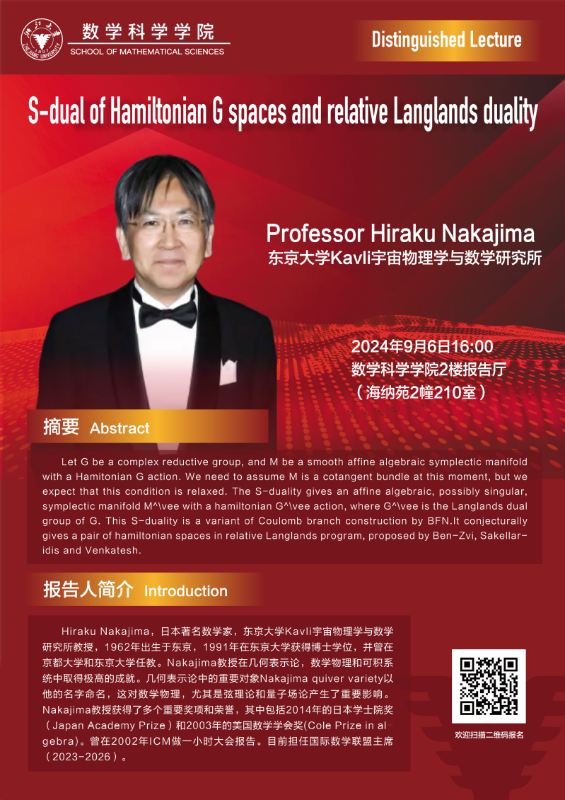 学术科研 学术团队 学术活动 学术会议 学术报告 讨论班 School Colloquium 信息公告 文件汇编 School Colloquium 华体会(中国) > Distinguished Lecture——S-dual of Hamiltonian G spaces and relative Langlands duality 来源:数学科学学院 发布时间:2024-09-02 246
