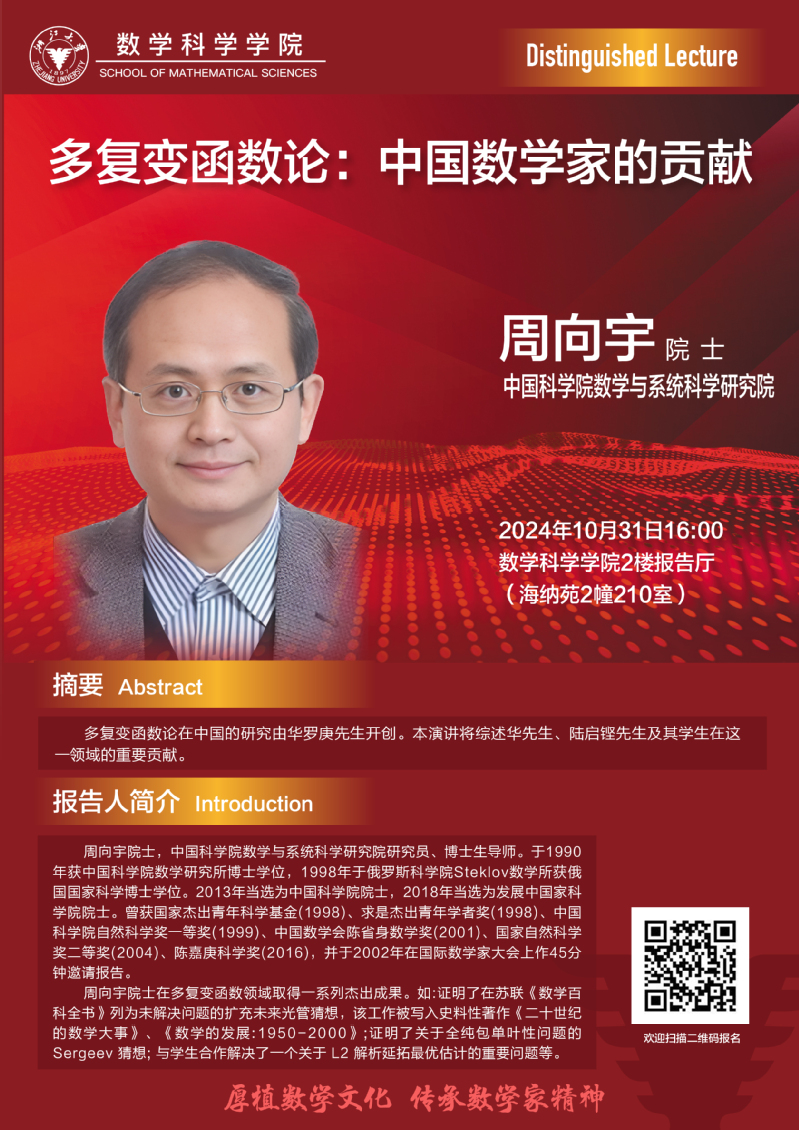 学术科研 学术团队 学术活动 学术会议 学术报告 讨论班 School Colloquium 信息公告 文件汇编 School Colloquium 华体会(中国) > Distinguished Lecture——多复变函数论:中国数学家的贡献 来源:数学科学学院 发布时间:2024-10-29 363