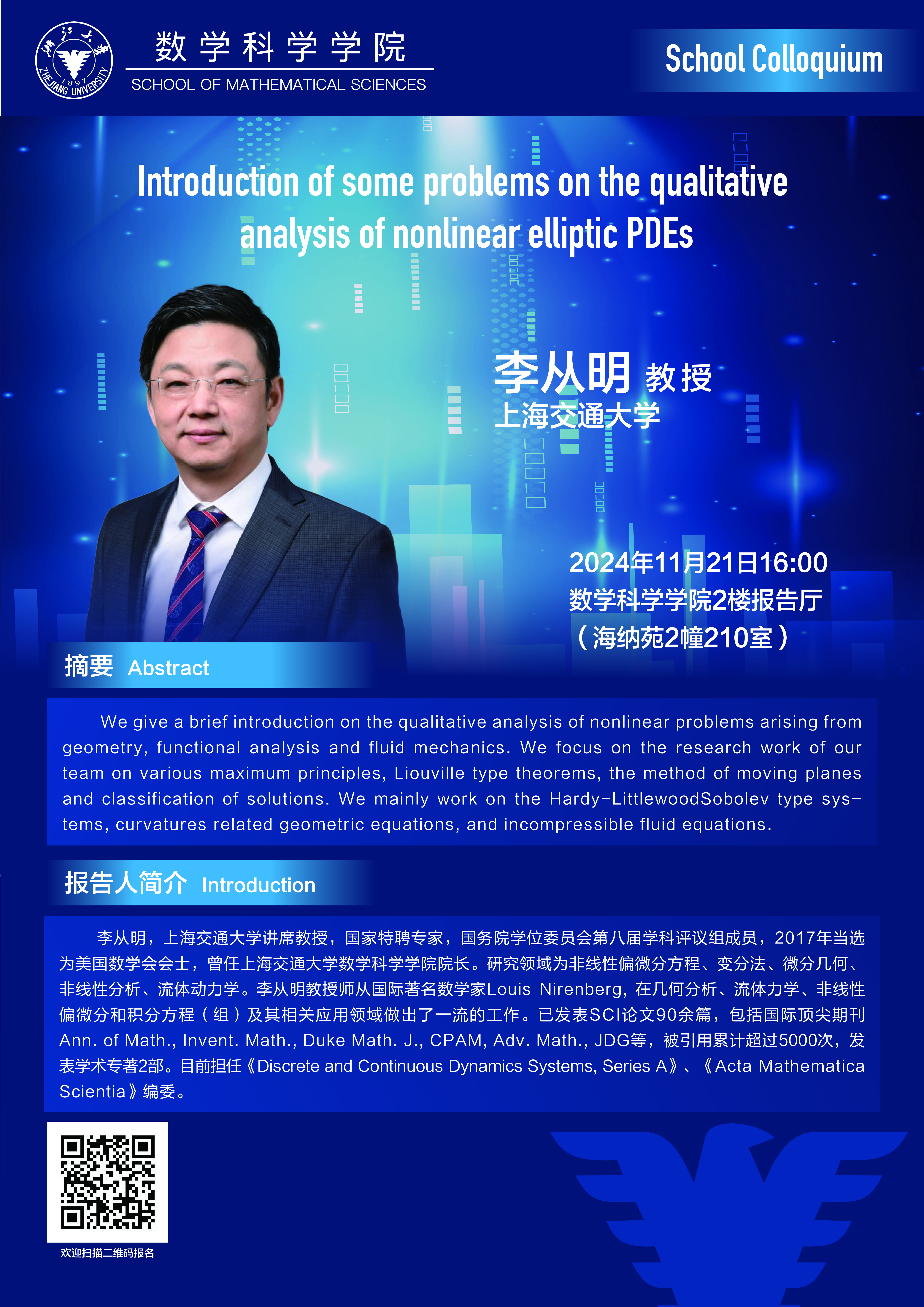 学术科研 学术团队 学术活动 学术会议 学术报告 讨论班 School Colloquium 信息公告 文件汇编 School Colloquium 华体会(中国) > School Colloquium——Introduction of some problems on the qualitative analysis of nonlinear elliptic PDEs 来源:数学科学学院 发布时间:2024-11-18 245