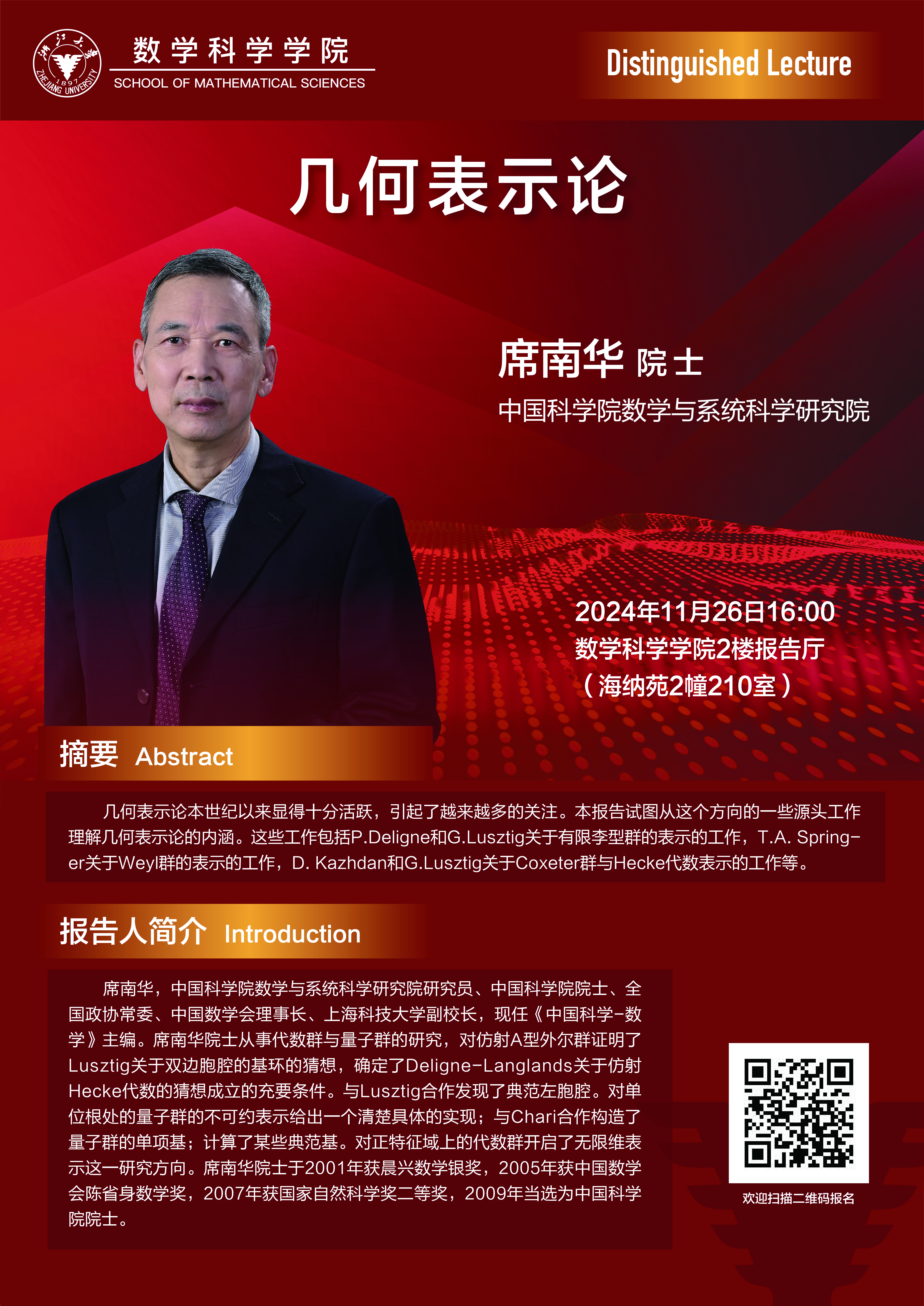 学术科研 学术团队 学术活动 学术会议 学术报告 讨论班 School Colloquium 信息公告 文件汇编 School Colloquium 华体会(中国) > Distinguished Lecture——几何表示论 来源:数学科学学院 发布时间:2024-11-19 357