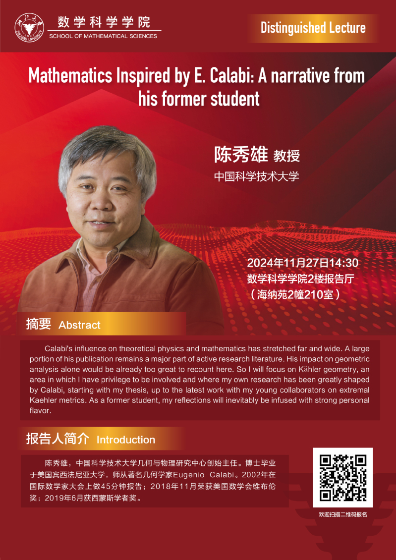 学术科研 学术团队 学术活动 学术会议 学术报告 讨论班 School Colloquium 信息公告 文件汇编 School Colloquium 华体会(中国) > Distinguished Lecture——Mathematics Inspired by E. Calabi: A narrative from his former student 来源:数学科学学院 发布时间:2024-11-25 346