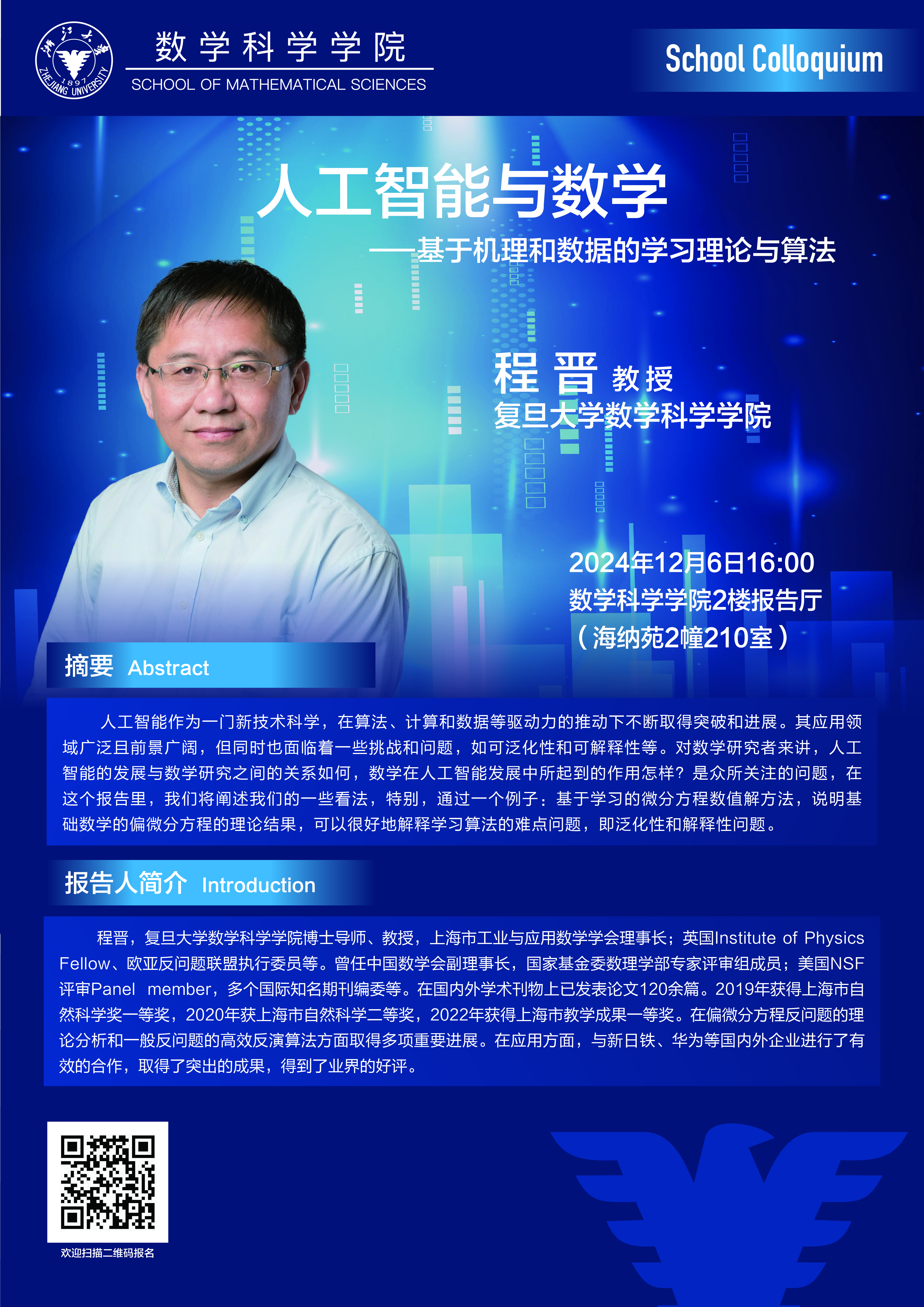 学术科研 学术团队 学术活动 学术会议 学术报告 讨论班 School Colloquium 信息公告 文件汇编 School Colloquium 华体会(中国) > School Colloquium——人工智能与数学--基于机理和数据的学习理论与算法 来源:数学科学学院 发布时间:2024-12-03 252