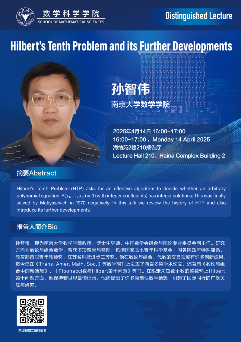 学术科研 学术团队 学术活动 学术会议 学术报告 讨论班 School Colloquium 信息公告 文件汇编 School Colloquium 华体会(中国) > Distinguished Lecture——Hilbert's Tenth Problem and its Further Developments 来源:数学科学学院 发布时间:2025-04-08 176