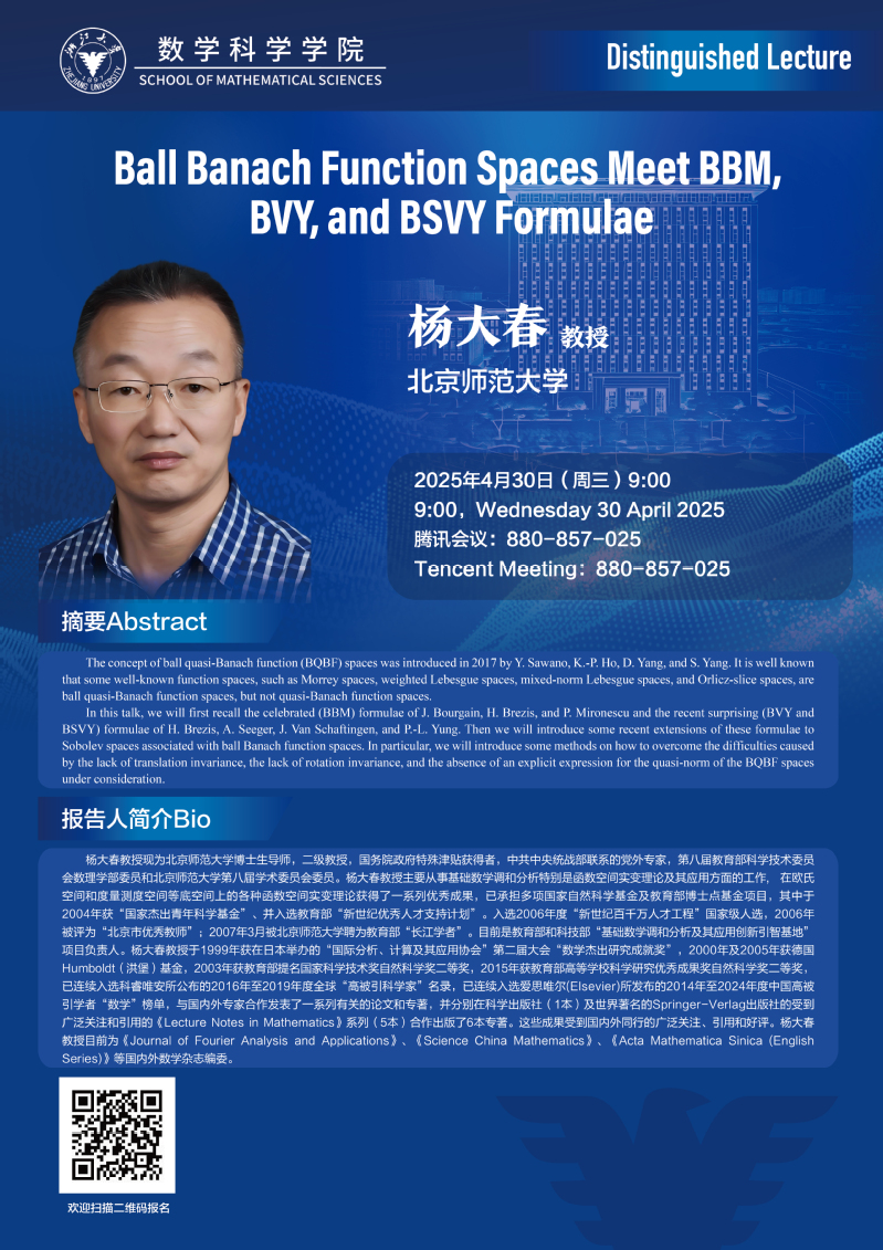 学术科研 学术团队 学术活动 学术会议 学术报告 讨论班 School Colloquium 信息公告 文件汇编 School Colloquium 华体会(中国) > Distinguished Lecture——Ball Banach Function Spaces Meet BBM, BVY, and BSVY Formulae 来源:数学科学学院 发布时间:2025-04-29 181