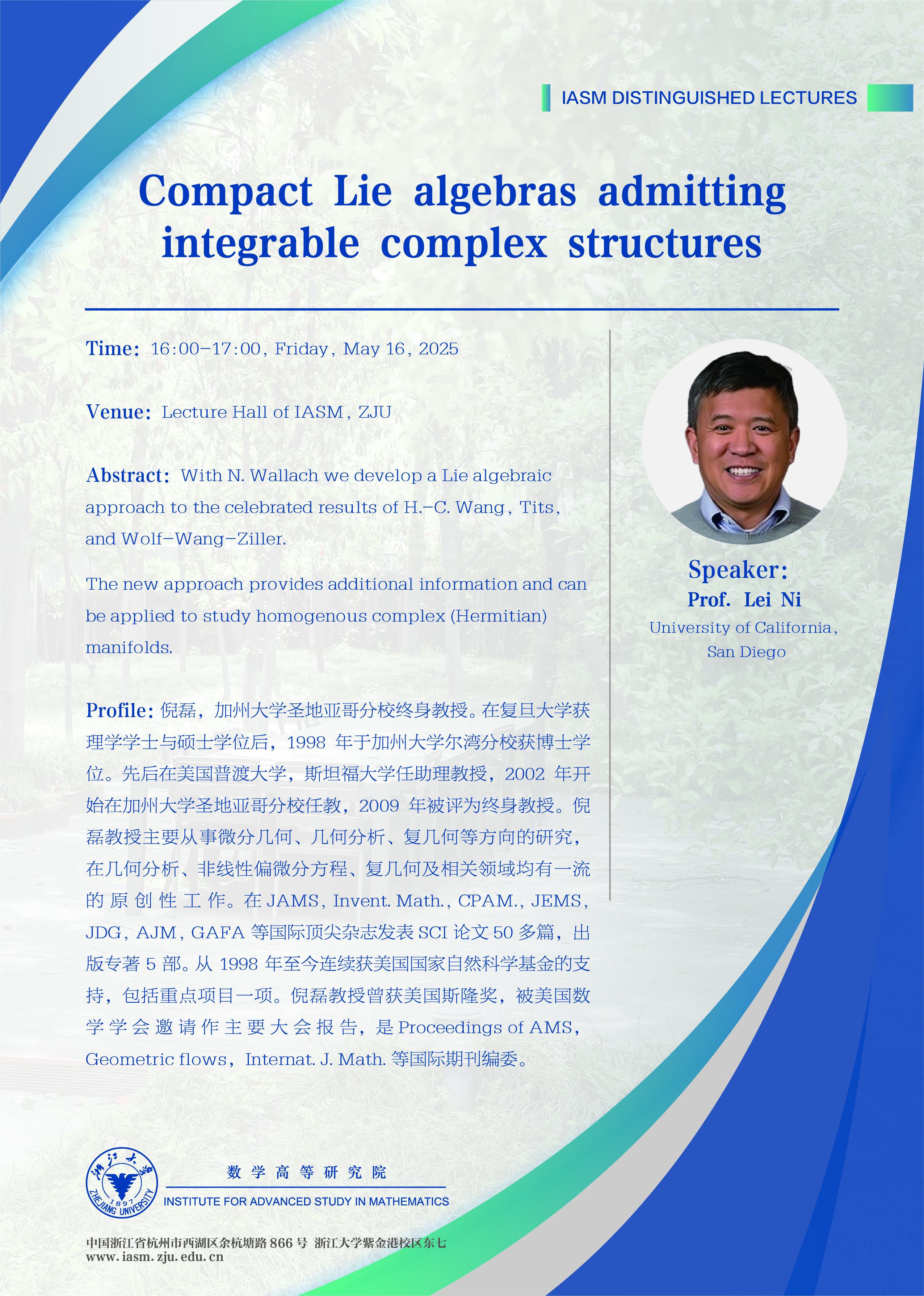 学术科研 学术团队 学术活动 学术会议 学术报告 讨论班 School Colloquium 信息公告 文件汇编 School Colloquium 华体会(中国) > IASM Distinguished Lectures——Compact Lie algebras admitting integrable complex structures 来源:数学科学学院 发布时间:2025-05-16 133