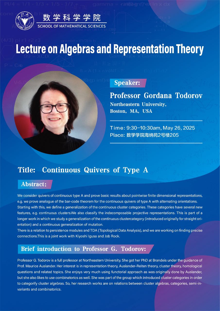 学术科研 学术团队 学术活动 学术会议 学术报告 讨论班 School Colloquium 信息公告 文件汇编 讨论班 华体会(中国) > 代数与表示论讨论班——Continuous Quivers of Type A 来源:数学科学学院 发布时间:2025-05-26 57
