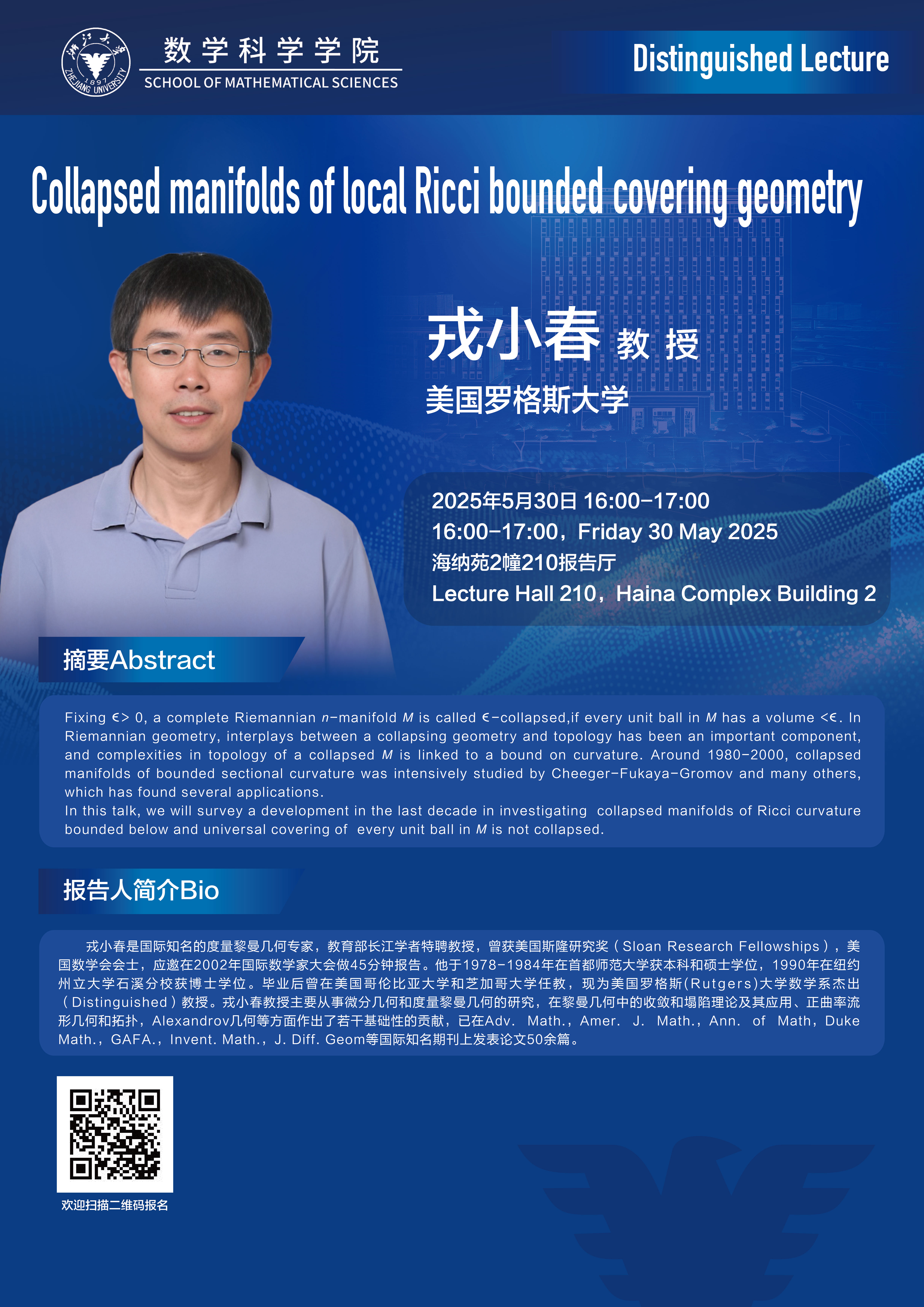 学术科研 学术团队 学术活动 学术会议 学术报告 讨论班 School Colloquium 信息公告 文件汇编 School Colloquium 华体会(中国) > Distinguished Lecture——Collapsed manifolds of local Ricci bounded covering geometry 来源:数学科学学院 发布时间:2025-05-23 31