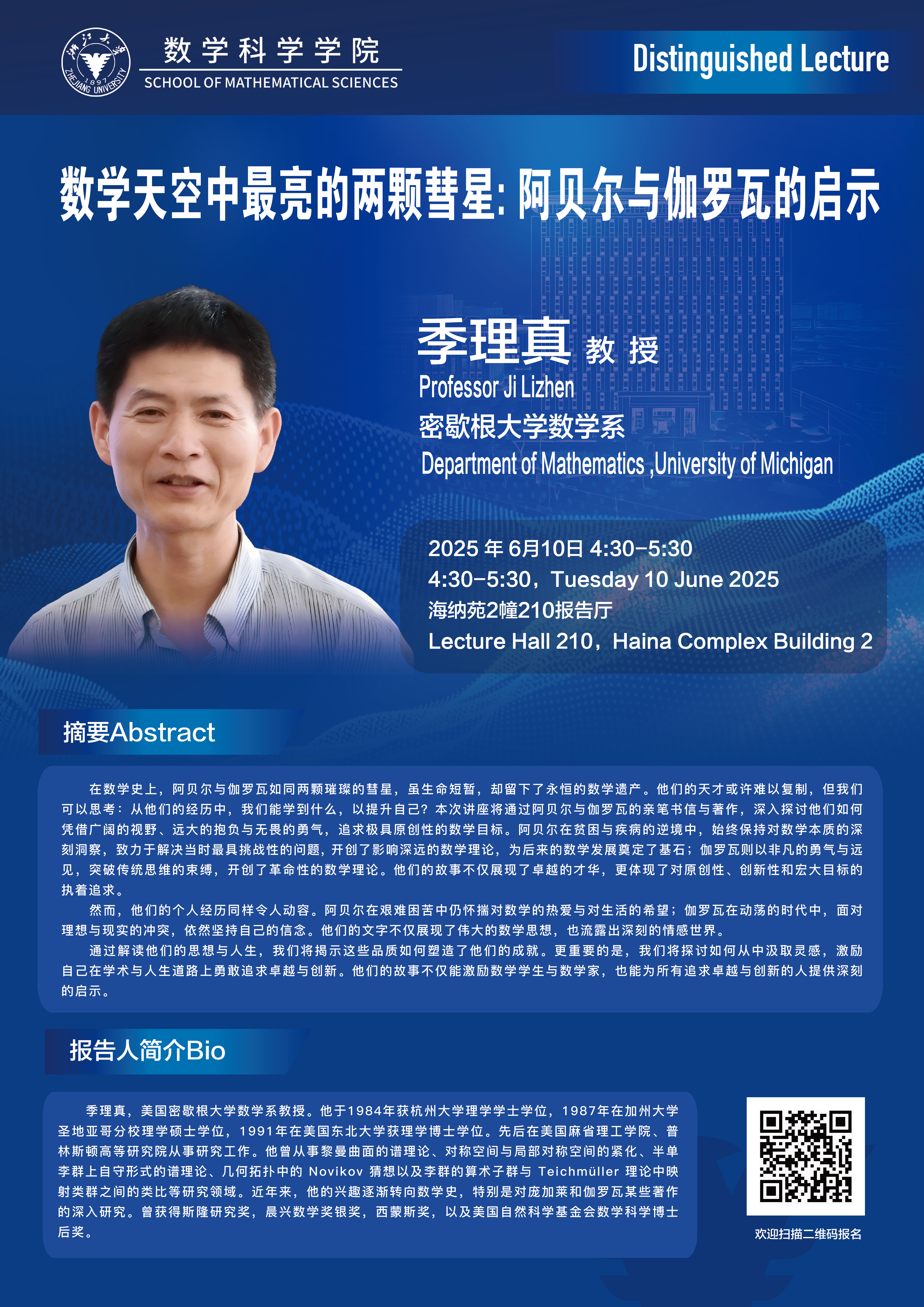 学术科研 学术团队 学术活动 学术会议 学术报告 讨论班 School Colloquium 信息公告 文件汇编 School Colloquium 华体会(中国) > Distinguished Lecture——数学天空中最亮的两颗彗星: 阿⻉尔与伽罗⽡的启示 来源:数学科学学院 发布时间:2025-06-07 21