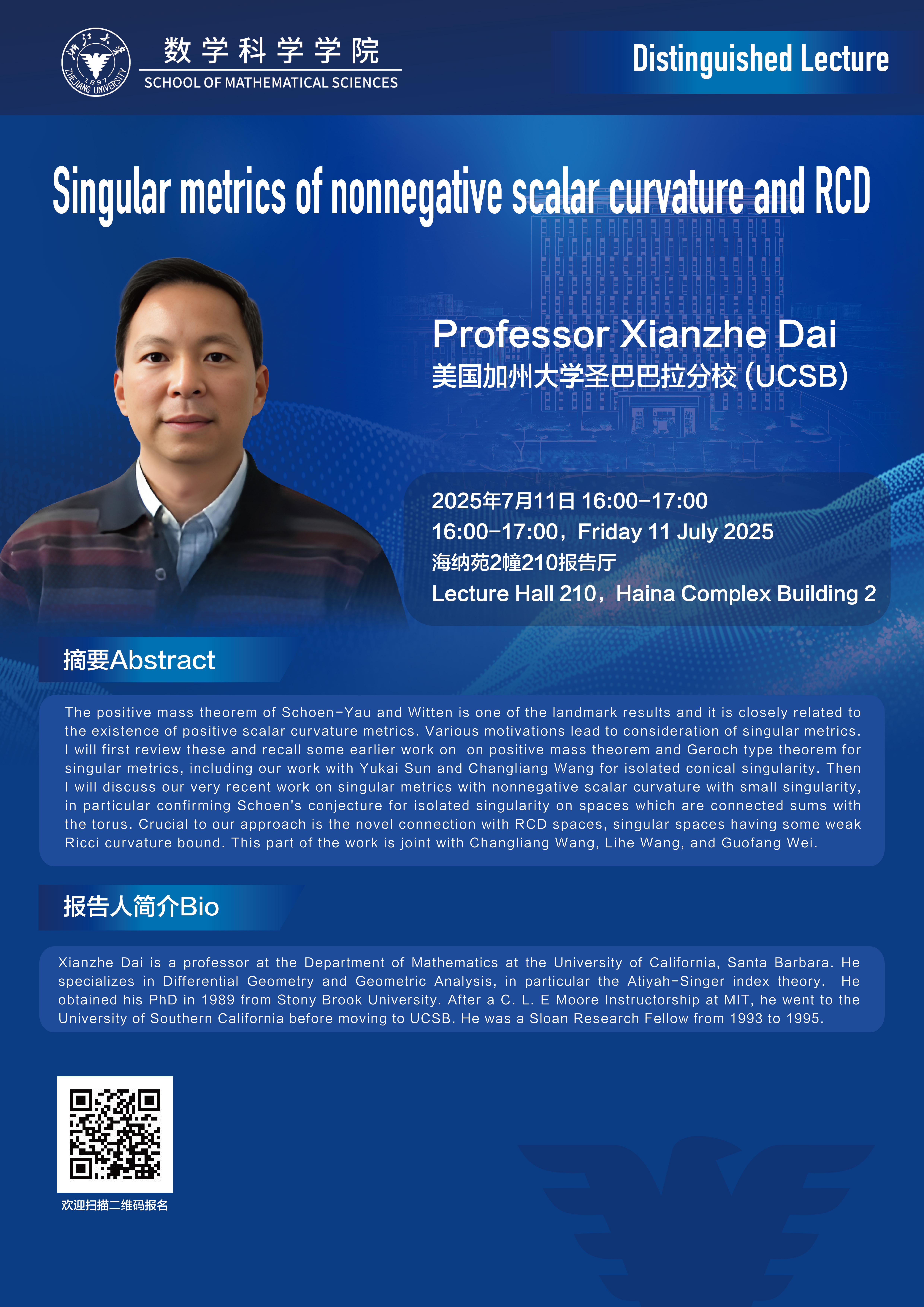 学术科研 学术团队 学术活动 学术会议 学术报告 讨论班 School Colloquium 信息公告 文件汇编 School Colloquium 华体会(中国) > Distinguished Lecture——Singular metrics of nonnegative scalar curvature and RCD 来源:数学科学学院 发布时间:2025-07-09 360