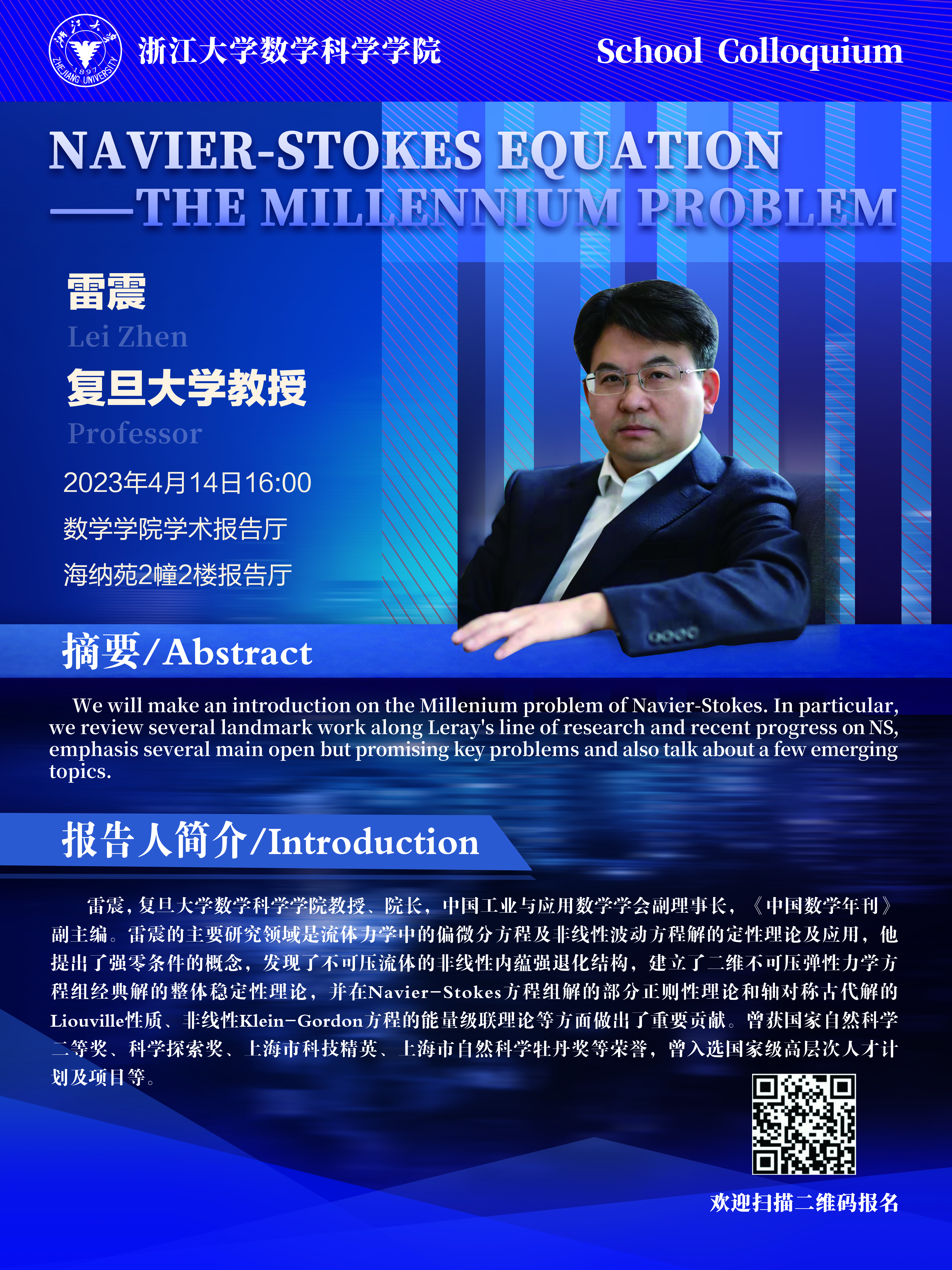 Seminars Seminars School Colloquium Conferences Position : homepage EVENTS Seminars School Colloquium:Navier-Stokes Equation ——The Millennium Problem 2023-04-14 16:00:00 2023-04-14 16:00:00 2023-04-14 16:00:00 Speaker : 4:00PM, Lei Zhen Time : 2023-04-14 16:00:00 Location : Date: 2023-04-13 Visitcount : 70