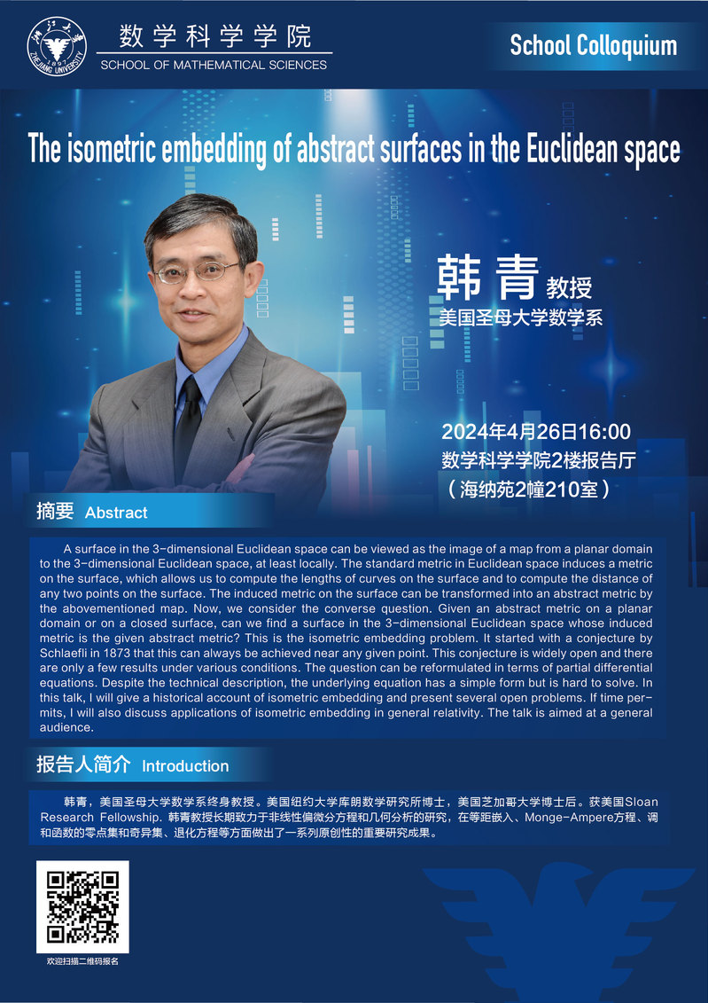 School Colloquium——The isometric embedding of abstract surfaces in the Euclidean space